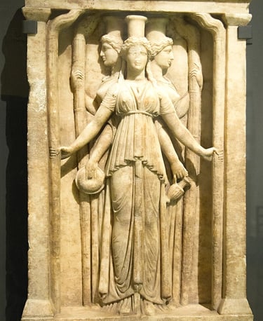 In Greek mythology, Hekate (also spelled Hecate) is the three-faced goddess of the crossroads, able to see where we’ve come from, where we are, and where we might go. Her three-way vision connects past, present, and future, making her a symbol of guidance through life’s transitions.